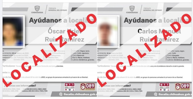 La Fiscalía de Distrito Zona Noroeste informa que han sido localizados en buen estado de salud, los dos jóvenes que habían sido privados de la libertad junto con una persona mayor en el municipio de Nuevo Casas Grandes el pasado 2 de abril.