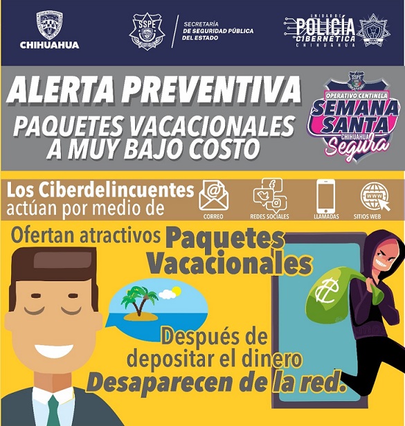 La Unidad de Policía Cibernética de la Secretaría de Seguridad Pública del Estado (SSPE) alertó a la población sobre un fraude en el que ciberdelincuentes se dedican a ofrecer paquetes vacacionales a bajos precios.