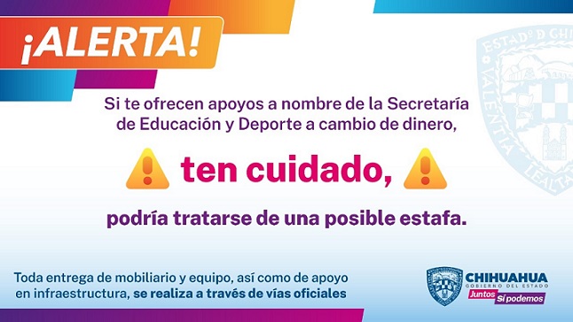 La dependencia enfatizó que toda notificación y entrega de mobiliario y equipo, así como de apoyo en infraestructura, se realiza a través de la estructura educativa y de las áreas correspondientes, como son la Dirección de Planeación y Evaluación de la SEyD y de Servicios Educativos del Estado de Chihuahua (SEECH), y el Instituto Chihuahuense de Infraestructura Física Educativa (Ichife).