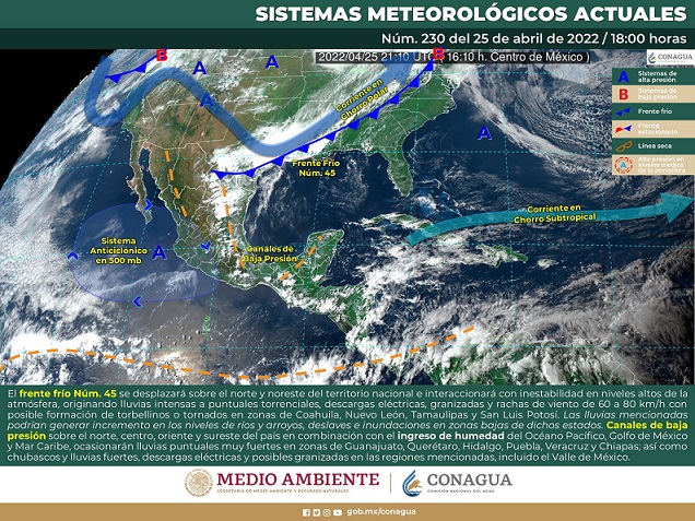 En el transcurso de la tarde-noche, el frente frío Núm. 45 se desplazará sobre el norte y noreste del territorio nacional e interaccionará con inestabilidad en niveles altos de la atmósfera.