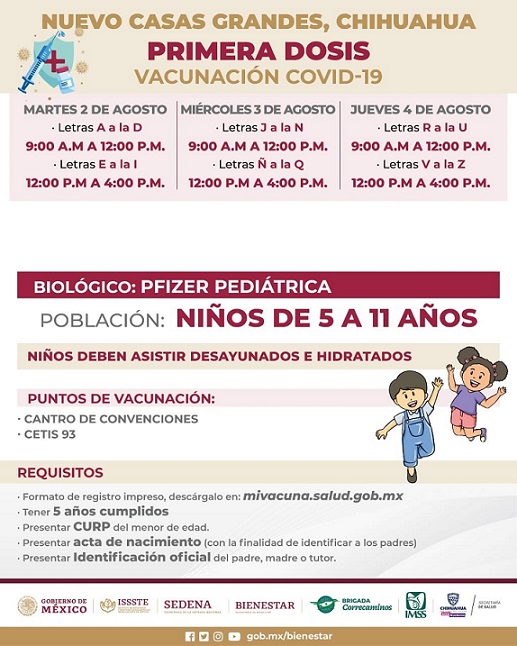 Mario Saldaña coordinador regional federal informa a que el próximo martes 2, miercoles3 y jueves 4 de agosto se iniciara con vacunación a niños de 5 a 11 años de edad en Nuevo Casas Grandes, hace énfasis que también se vacunara a niños del vecino municipio de Casas Grandes.