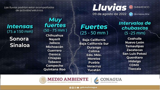 El pronóstico meteorológico para hoy es de lluvias intensas (de 75 a 150 milímetros [mm]) en Sinaloa y Sonora; muy fuertes (de 50 a 75 mm) en Campeche, Chiapas, Chihuahua, Guerrero, Jalisco, Michoacán, Nayarit, Oaxaca, Quintana Roo y Tabasco.
