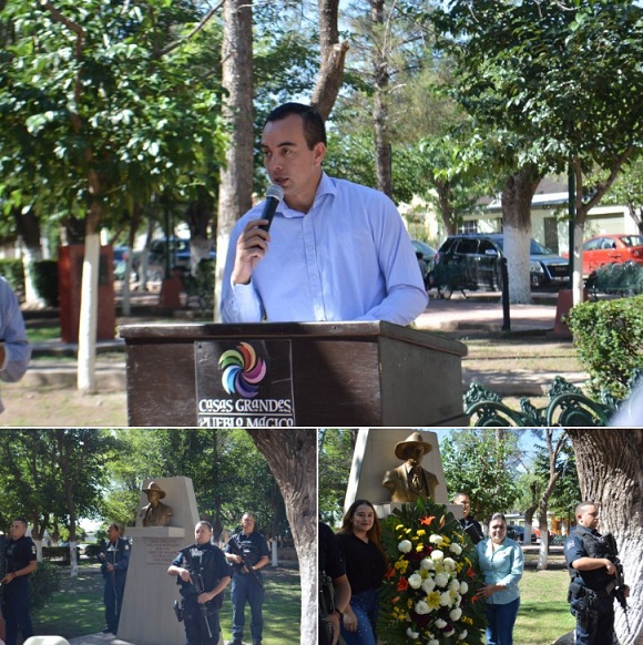 El secretario municipal José Antonio Casas, con la representación del alcalde Roberto Lucero, abrió el acto conmemorativo que se celebró en la plaza principal, justo frente al punto en el que se ubica el busto de general revolucionario.