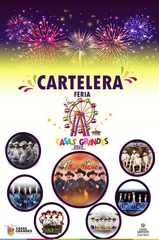 Municipio de Casas Grandes dio a conocer la cartelera de grupos que asistirán a la Feria Casas Grandes 2022, participan grupos locales y foráneos de Cd. Juárez, Chihuahua, Cuauhtémoc y Monterrey, Nuevo León.