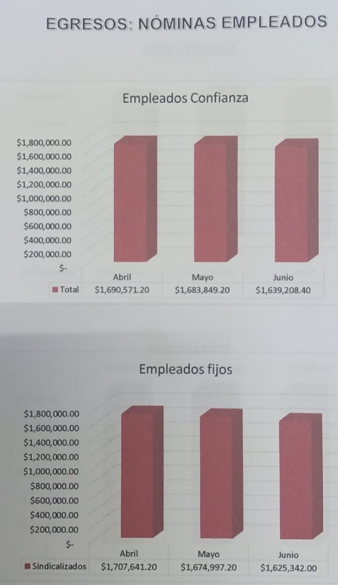 Entre los egresos del municipio resalto lo alto que esta la nomina el municipio paga una cantidad casi igual a empleados sindicalizados que a los de confianza.
