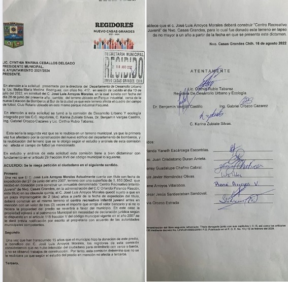 Por lo tanto, determinan que no se reubicara y establecen que José Luis Arroyos Morales deberá construir el Centro Recreativo Infantil Juvenil de Nuevo Casas Grandes, para lo cual fue donado el terreno en un lapso a no mayor a un año a partir de la fecha de este dictamen.