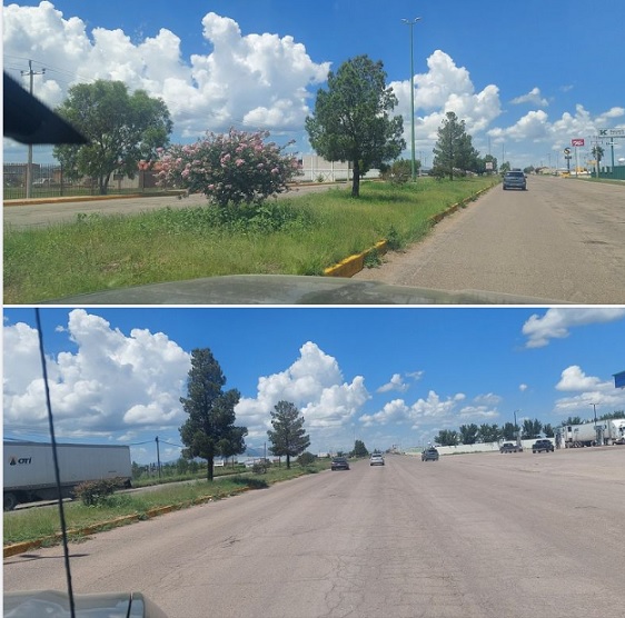 Las entradas de a la ciudad de Nuevo Casas Grandes se encuentran en pésimas condiciones, tanto en sus calles llenas de baches intransitables donde varios vehículos y hasta un tracto camión ha quedado varado, como llenas de hierba y basura en los camellones.