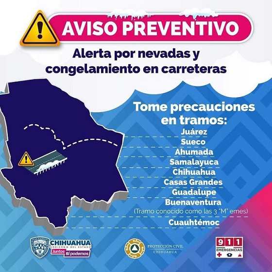 La CEPC pide a la población mantener especial cuidado, por la probabilidad de congelamiento en tramos carreteros, especialmente en el de Janos-Aguaprieta, conocido como ´puerto San Luis, y Puerto Las Tres M sobre la carretera a Buenaventura.