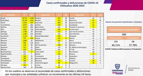 Decesos por municipio: Juárez (+17), Chihuahua (+18), Parral (+2), Jiménez (+1), Buenaventura (+1), Casas Grandes (+1), Urique (+1) y Valle de Zaragoza (+1).
