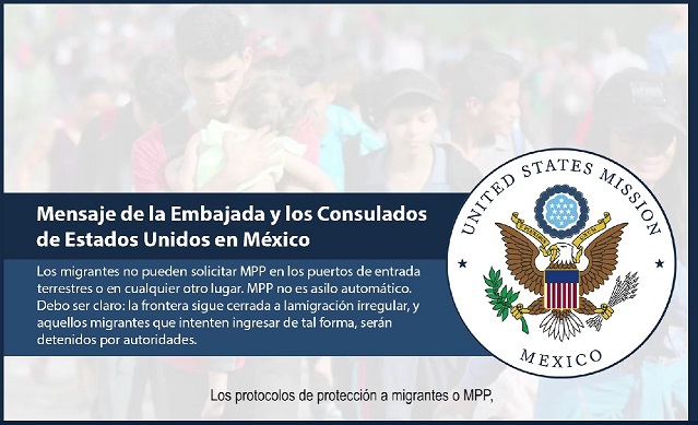 Los migrantes no pueden solicitar MPP en los puertos de entrada terrestres o en cualquier otro lugar. MPP no es asilo automático. Debo ser claro: la frontera sigue cerrada a la migración irregular, y aquellos migrantes que intenten ingresar de tal forma serán detenidos por autoridades de Aduanas y Protección Fronteriza. El programa de MPP es tan solo uno de los muchos programas que autoridades utilizan bajo el sistema de inmigración de los Estados Unidos. La frontera con Estados Unidos permanece cerrada a la inmigración irregular. No te dejes engañar por aquellos que te digan lo contrario: Bobby García, Agregado de CBP en la Embajada de Estados Unidos en México.
