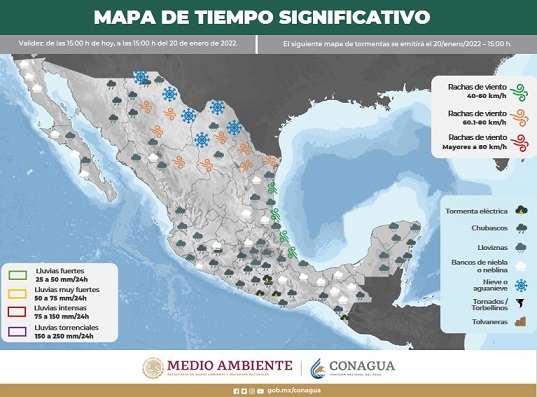 Además de las lluvias o caída de nieve, advierten por viento con rachas de 60 a 70 km/h y tolvaneras.