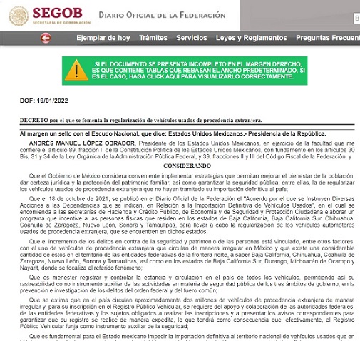 El Gobierno federal publicó el decreto por el que fomenta la regularización de vehículos usados de procedencia extranjera.