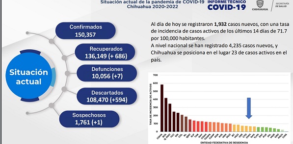 La Secretaría de Salud de Chihuahua, informó que el acumulado de casos en el estado es de 150 mil 357; 136 mil 149 son casos recuperados; 108 mil 470 descartados y 1,761 son casos sospechosos.