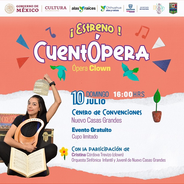 La Secretaría de Cultura de Gobierno del Estado a través del programa Alas y Raíces, invita al concierto “Cuentópera” a realizarse por primera vez en Chihuahua, este domingo 10 de julio a las 04:00 de la tarde, de forma gratuita en el Centro de Convenciones en Nuevo Casas Grandes.
