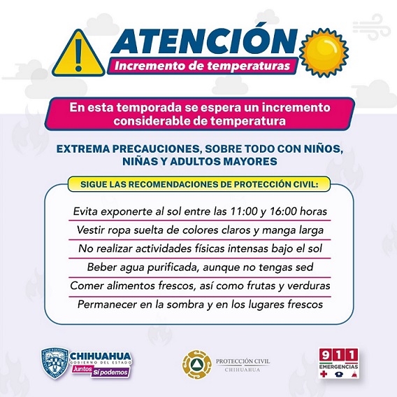 En ese sentido la CEPC emite una alerta preventiva ante el incremento de temperaturas, que oscilará desde los 28 hasta los 42 grados centígrados en las diversas regiones del estado a partir de este inicio de semana.