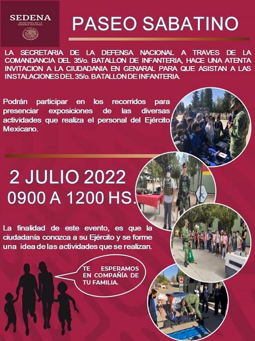 El 35/o. Batallón de Infantería (Nuevo Casas Grandes, Chih.), hace una atenta invitación a la ciudadanía en general para que este sábado 2 de julio 2022, asistan a las instalaciones militares, en virtud que se abrirán las puertas a la comunidad, para que disfrute de una serie de actividades.