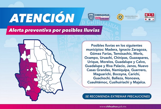 Con base a la información emitida por el Servicio Meteorológico Nacional (SMN), la CEPC informa que para esta tarde noche se prevé lluvias de moderadas a puntualmente fuertes con posible acumulación de 25.1 a 50 milímetros (mm) en los municipios de Moris, Chínipas, Guazapares, Urique, Batopilas, Morelos, Guadalupe y Calvo, Janos, Casas Grandes, Madera, Ocampo, Uruachi, Maguarichi, Bocoyna, Carichí, Guachochi y Balleza.