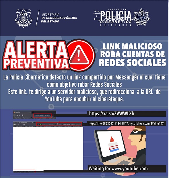 La Dirección de la Policía Cibernética de la Secretaría de Seguridad Pública del Estado (SSPE), detectó un link malicioso que circula a través de la aplicación "Messenger" de Facebook, el cual, al darle clic roba la información que el internauta guarda en sus distintas redes sociales.
