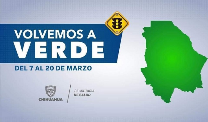 La Secretaría de Salud del Estado de Chihuahua informa que a partir del lunes 7 de marzo la entidad transitará a semáforo epidemiológico verde, esto tras la disminución de casos, hospitalizaciones y defunciones por COVID-19.