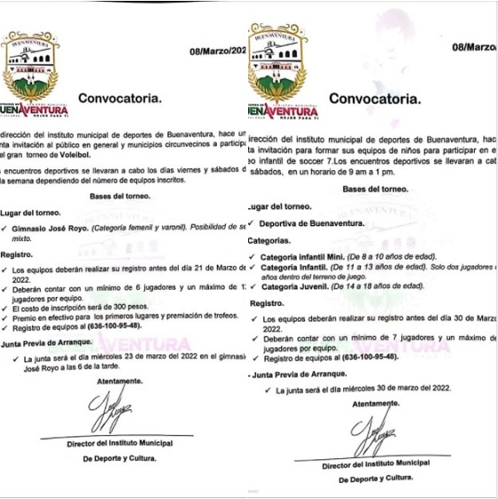 La dirección del instituto municipal de Buenaventura esta invitando a la población en general y municipios vecinos a participar en torneo de voleibol.