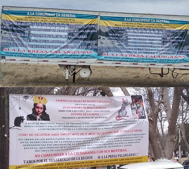 Las lonas señalan que ambos servidores públicos, han mal informado a la gente de Ascensión y JANOS sobre el proyecto de construcción de la citada presa con mentiras, buscando que se cancele o se posponga una obra que traerá muchos beneficios, no solamente a los productores, sino a la población en general de Casas Grandes y Nuevo Casas Grandes.