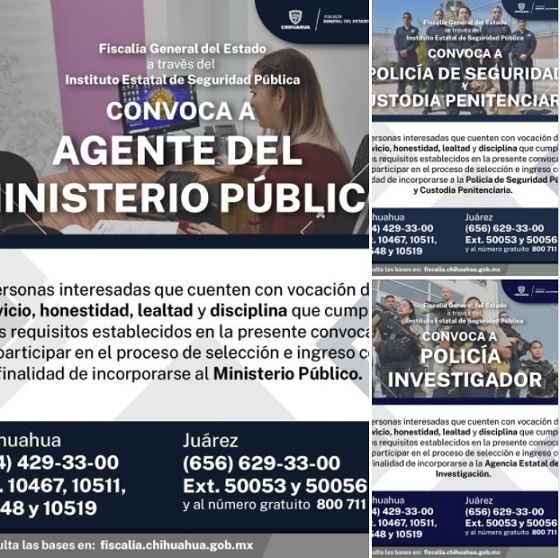 Para mayor información sobre requisitos y el proceso completo de selección, la Fiscalía General del Estado pone a disposición de las y los interesados, la siguiente dirección electrónica: http://fiscalia.chihuahua.gob.mx/convocatorias/ |