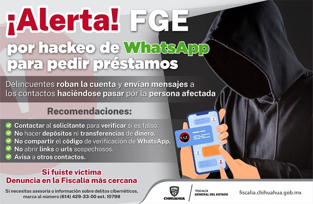 Por lo anterior, se hace un llamado a las personas afectadas por el robo de cuentas de WhatsApp, para que acudan a interponer la denuncia correspondiente ante el Ministerio Público con el fin de ampliar las investigaciones e identificar a los delincuentes cibernéticos que afectan el patrimonio de las familias chihuahuenses.