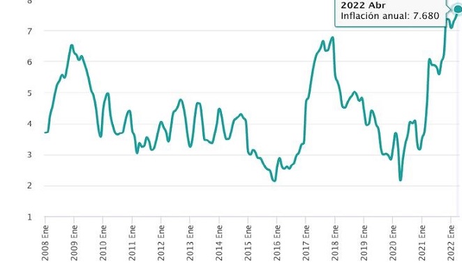 En la publicación de hoy 9 de mayo del 2022 explica que el Índice Nacional de Precios al consumidor y sus Componentes tuvo 7.68 puntos del mes de abril del 2021 al mismo mes en el 2022 y de manera subyacente segaría a 7.22%.