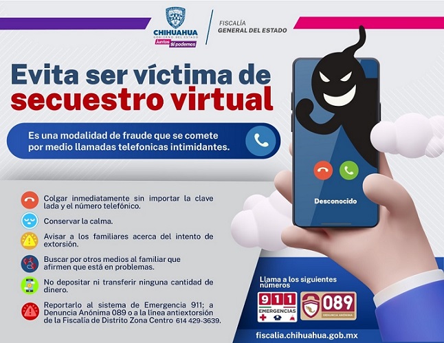 Con el objetivo de prevenir y combatir el delito de secuestro virtual, la Fiscalía de Distrito Zona Centro emite una serie de recomendaciones a la ciudadanía para evitar que sean víctimas de este ilícito