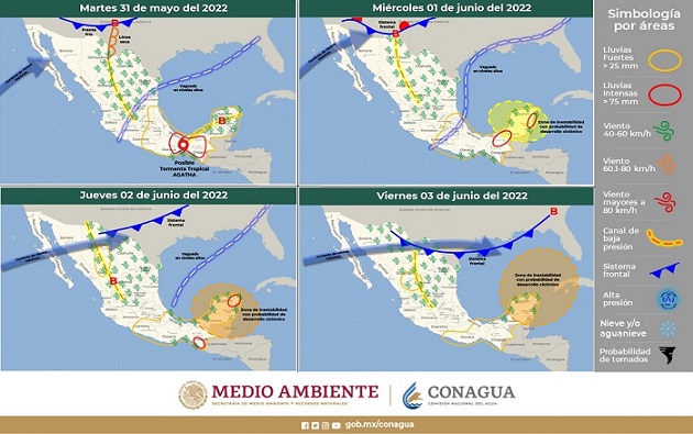 El pronóstico del SMN advierte que una inestabilidad atmosférica derivada de la presencia de una línea seca, canal de baja presión, un nuevo sistema frontal y arrastre de humedad son factores que podrán estar dejando lluvias en los siguientes días.