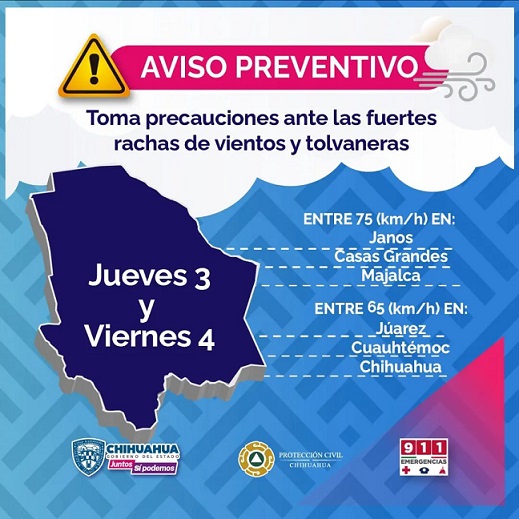 De acuerdo al pronóstico emitido por el Servicio Meteorológico Nacional, la Coordinación Estatal de Protección Civil (CEPC) informa que derivado del frente frío número 7, una vaguada polar y una línea seca se ocasionarán vientos fuertes con tolvaneras y descenso de temperatura sobre municipios del noroeste y norte del estado, para este próximo fin de semana, con incremento de nubosidades y probabilidades de caída de nieve y aguanieve en regiones de Casas Grandes y Cuauhtémoc-Madera.