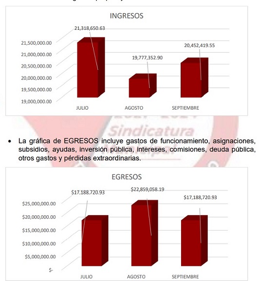 El municipio reporta un gasto de julio $17,188,720.93, agosto $22,859,058.19 y septiembre $17,188,720.93.