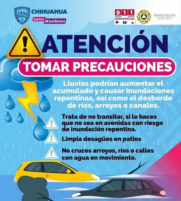 Ante estas condiciones, la Coordinación Estatal de Protección Civil pide a la población a mantener las medidas preventivas debido a la presencia de lluvias en el estado, por lo que solicita evitar transitar por calles o avenidas con riesgo de inundación repentina, así como no tratar de cruzar por ríos, arroyos o canales.