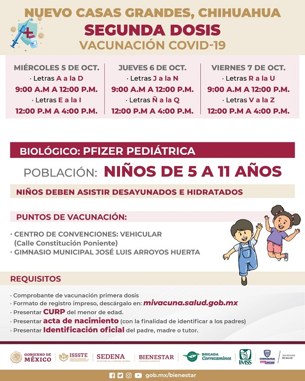 Los menores deber acudir acompañados de su tutor, si es segunda dosis llevar su comprobante de su vacuna y llevar pre llenado el expediente de vacunación lo puede bajar de: https://mivacuna.salud.gob.mx/index.php