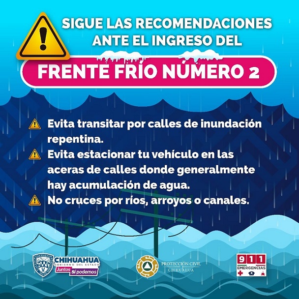 Mientras que para el miércoles 5 de octubre, se espera el posible ingreso del Frente Frío número 2 que intensificará las lluvias y hará descender el valor de las temperaturas máximas entre 2 y 4 grados, y favorecerá las precipitaciones en Bocoyna, Carichí y Morelos, municipios que podrían acumular valores superiores a 30 milímetros (mm) en 24 horas de lluvias; entre 10 y 25 mm en el lapso de un día para Ahumada, Chihuahua, Riva Palacio, Cuauhtémoc, Bachíniva, Guadalupe y Calvo, Guachochi y de 0 y 10 mm en el resto de la región serrana, Ascensión, Casas Grandes, Nuevo Casas Grandes, Juárez, Praxedis y Guadalupe.