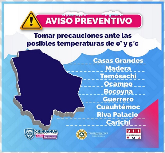 Además se dio a conocer que los municipios donde se estima habrá mayor descenso de temperatura son Casas Grandes, Madera, Temósachic, Ocampo, Bocoyna, Guerrero, Cuauhtémoc, Riva Palacio y Carichí, áreas en donde el valor mínimo podría encontrarse entre 0 y 5°C, con alta probabilidad de heladas.