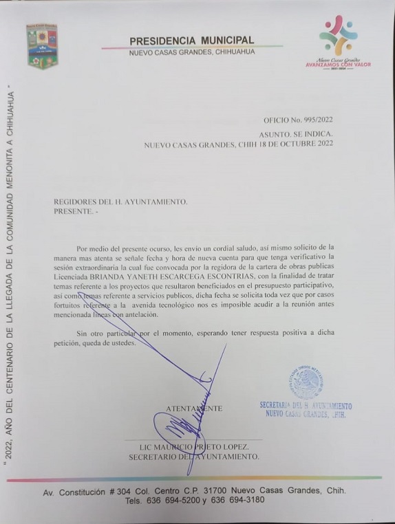 Se tenia confirmada sesión extraordinaria de cabildo en Nuevo Casas Grandes para este viernes a las 4 de la tarde donde se tratarían asuntos de servicios públicos específicamente la recolección de basura y los proyectos que resultaron beneficiados con el presupuesto participativo.