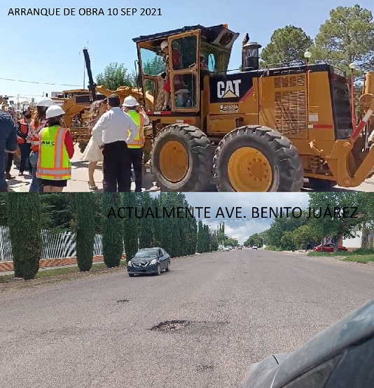A casi un año que la alcaldesa Cynthia Ceballos anunciara con algarabía la importante obra con la iniciaría su administración municipal. El recarpeteo del pavimento de la Ave. Benito Juárez iniciando en la calle 9 de Col. Dublan, para que se ubique mejor en la escuela Manuel Dublan hasta la calle Victoria en el semáforo del IMSS, las felicitaciones por redes sociales no se dejaron esperar y muy contentos los neocagrandenses, la alcaldesa iniciaba con el pie derecho pues anunciaba un largo tramo de pavimento para Nuevo Casas Grandes