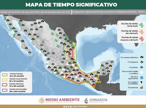 Se esperan lluvias de aisladas a dispersas en Temósachic, Urique, Guadalupe y Calvo, Guachochi, Madera, Ocampo, Moris, Uruachi, Chínipas, Batopilas, Morelos, Balleza, Cuauhtémoc, Chihuahua (Majalca), Delicias, Camargo, Jiménez, Parral, Santa Bárbara y Matamoros.