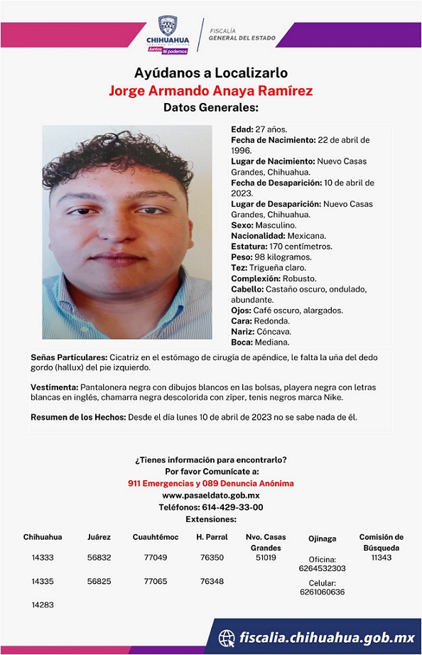De nueva cuenta se registró la desaparición de una persona en la zona de Nuevo Casas Grandes, en el área noroeste del Estado, pues de acuerdo a la información de familiares y amigos, el joven Anaya Ramírez, no ha sido localizado piden ayuda a la población de informes de cualquier dato.