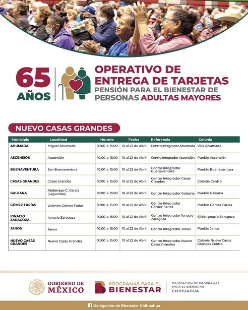 Los operativos de entrega se realizan del 10 al 22 de abril en los Centros Integradores de cada una de las 10 regiones en las que se divide el estado y que encabezan los municipios de Chihuahua, Cuauhtémoc, Delicias, Guachochi, Guerrero, Hidalgo del Parral, Juárez, Nuevo Casas Grandes, Ojinaga y Urique.