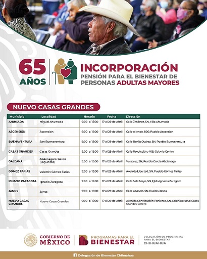 Chihuahuenses que en marzo y abril cumplen o cumplieron 65 años de edad podrán incorporarse al programa "Pensión para el Bienestar de las Personas Adultas Mayores" en los 72 módulos habilitados en toda la entidad.