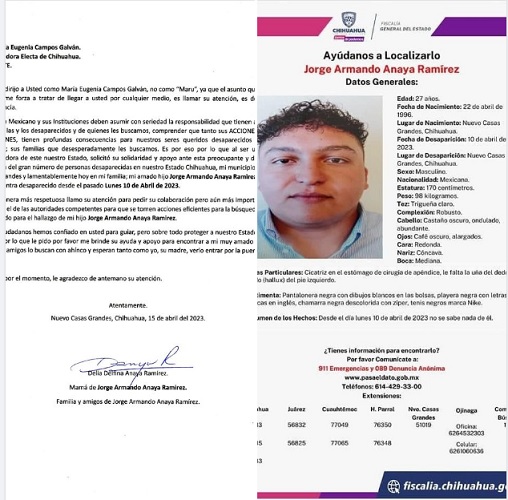 Madre del joven Jorge Armando Anaya Ramírez, desparecido desde 10 de abril del año en curso en Nuevo Casas Grandes, escribe carta a la gobernadora María Eugenia Campos Galván donde le pide que la Instituciones del Estado Mexicano deben asumir con seriedad la responsabilidad que tienen ante la vida de los desaparecidos y de quienes lo buscan.