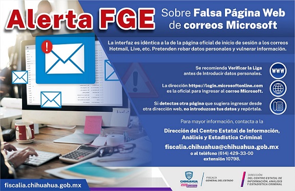 La Fiscalía General del Estado, a través de su Dirección de Análisis de Evidencia Digital e Informática Forense (DAEDIF), recomienda a la ciudadanía estar alerta para evitar ingresar a una dirección electrónica que simula ser la página de inicio de sesión para ingresar a correos de Microsoft (Hotmail, Live, etc) para robar datos confidenciales.