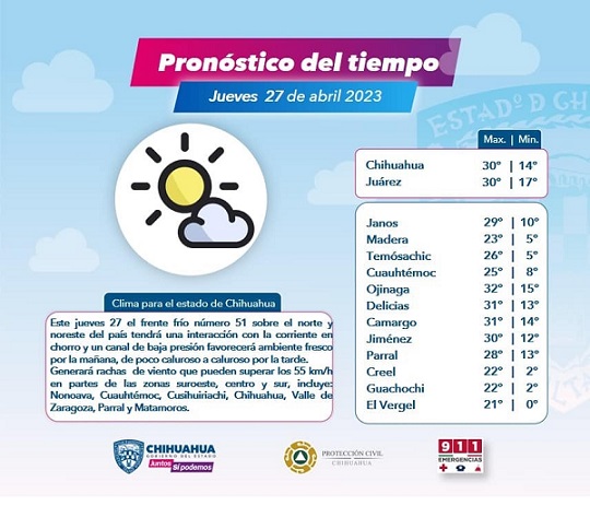 Mientras que para el jueves 27, se pronostica que el termómetro alcance los 30°C en Chihuahua y Juárez 30; en Delicias y Camargo los 31 grados, Janos 29, Parral 28 y Cuauhtémoc 25.
