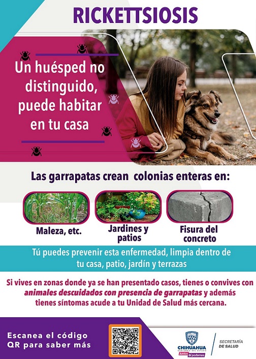 La Secretaría de Salud de Chihuahua, exhorta a la ciudadanía a reforzar las medidas de prevención ante el padecimiento de la rickettsiosis, como es la limpieza del hogar, patios y jardines, los cuidados pertinentes en las mascotas, así como la higiene personal en los integrantes de la familia.