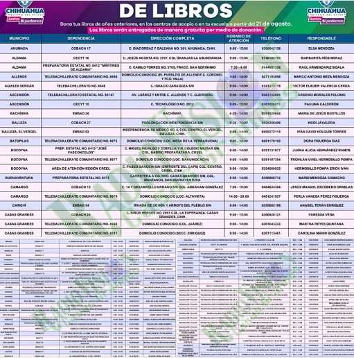 La titular del Ejecutivo indicó que en el portal oficial del Gobierno del Estado http://chihuahua.gob.mx/, están incluidos los puntos a los que la ciudadanía puede acudir para la entrega del material didáctico, que será utilizado por los maestros para el inicio del ciclo escolar 2023-2024.