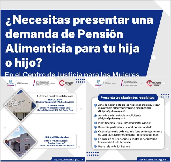 El Centro de Justicia para las Mujeres (CEJUM) y la Fiscalía Especializada en Atención a Mujeres Víctimas del Delito por Razones de Género y a la Familia de Distrito Norte (FEM), te asesoran en el proceso para iniciar una demanda de pensión alimenticia o denunciar el incumplimiento de la obligación alimentaria.