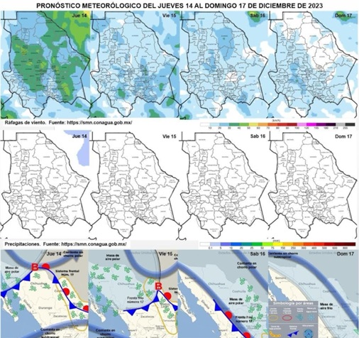 La CEPC, informó que debido al ingreso del frente frio número 17 para el viernes 15 de diciembre se espera un notorio descenso en las temperaturas, y se pronostican vientos de 5 a 35 kilómetros por hora en algunas partes de la entidad, sin ningún pronóstico de lluvias.