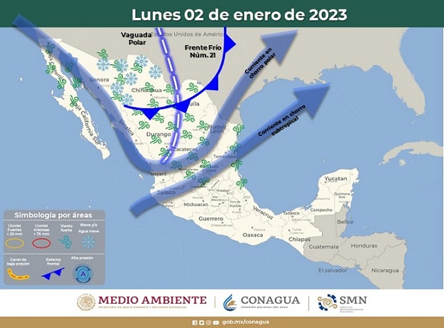 Lo anterior se debe al ingreso a territorio estatal del frente frío número 21, que se espera ocurra en el transcurso de la tarde de este 1 de enero, cuyos efectos pueden prolongarse para el lunes 2.